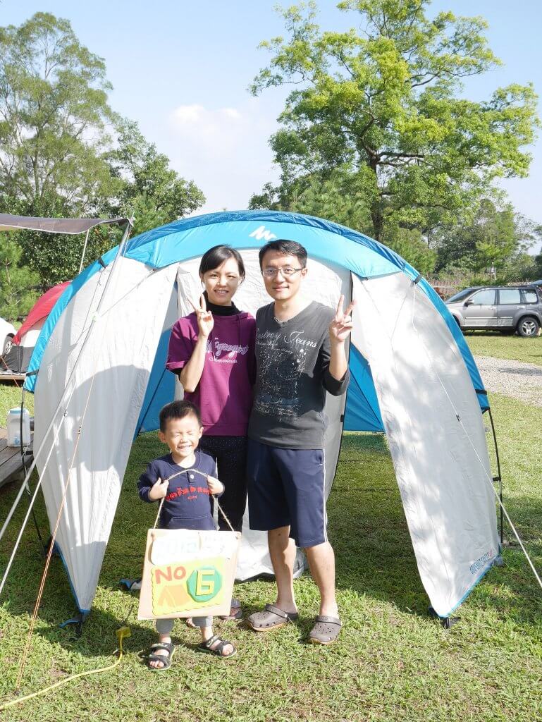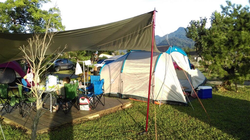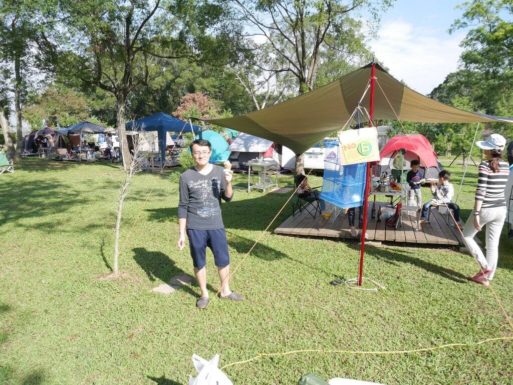 趁小孩陷入沙坑時,大人們趕緊搭帳。不過木棧板是3m x 3m,迪卡儂的帳篷較長,所以最後選擇搭在草地上,木棧板做煮飯吃飯使用。太陽下山照射很溫暖,有點刺眼XD,不過晚上吹的風是東風,所以從背後吹來。