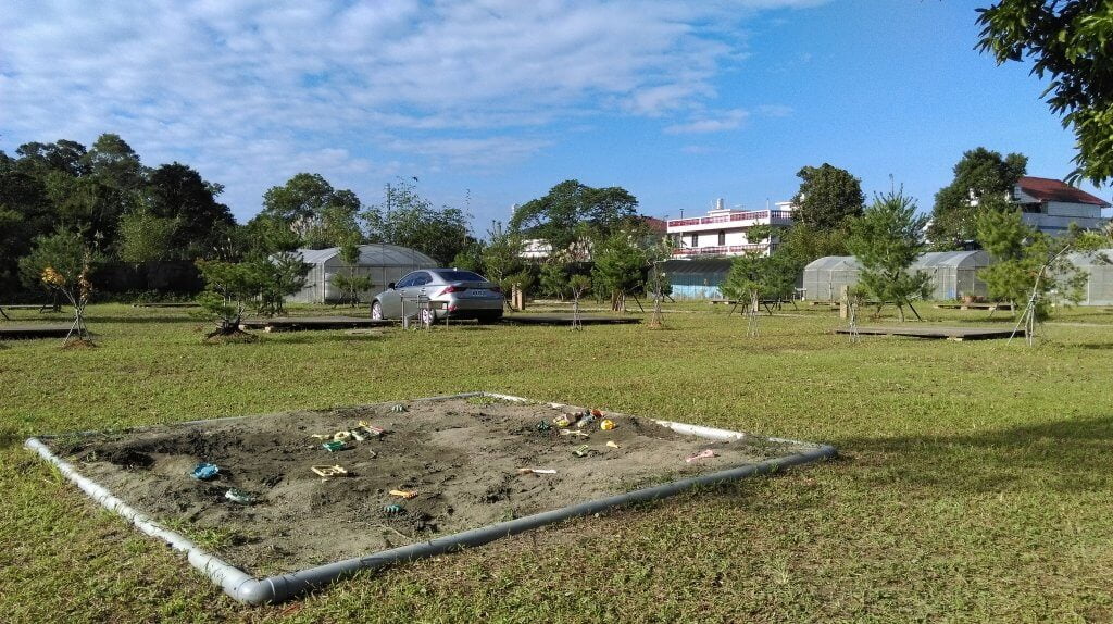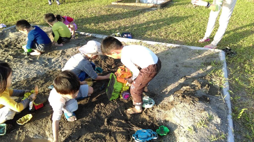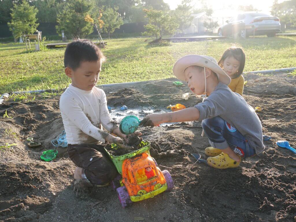 抵達營地後開始將小孩放入遊戲區,正中央有一個大沙坑可以玩耍,旁邊也有可以清洗的地方。