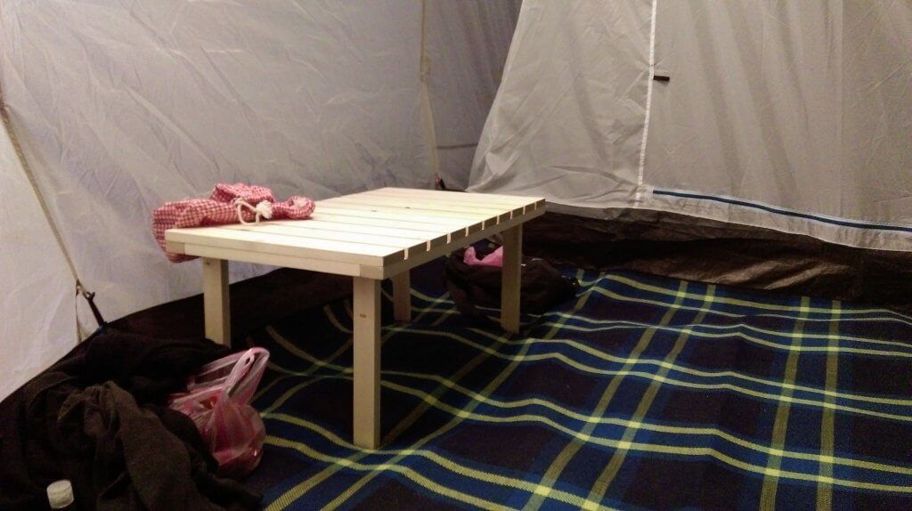 擺上自己DIY的松木組合式露營桌,簡單製作可以參考艾德之前的文章,擺起來很有質感XD。